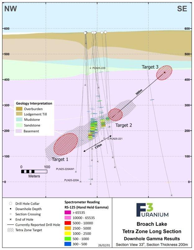 Das 3.000 m umfassende Diamantbohrprogramm wurde konzipiert, um das Ausmaß der Uranmineralisierung in der Zone Tetra weiter zu erproben, die zurzeit durch bedeutsame Abschnitte hervorgehoben wird, einschließlich PLN25-205, das 1,0 m mit 2,50 % U₃O₈ innerhalb eines breiteren Intervalls von 22,5 m mit durchschnittlich 0,26 % U₃O₈ ergab, und PLN25-219A, das eine Mineralisierung von 29,5 m durchteufte, einschließlich 27,5 m zusammenhängende Mineralisierung mit 2,30 m, die Werte von über 10.000 cps aufwiesen (siehe Pressemitteilung vom 10. November 2025). Das jüngste Herbstprogramm konnte die interpretierte Falllinie der Mineralisierung erfolgreich von 60 Metern auf 135 Meter verlängern. Die beiden westlichsten Bohrlöcher dieses Programms haben das Zielgebiet Interpretationen zufolge überschritten. Das Winterprogramm wird mit neigungsabwärts gerichteten und einfallenden Step-out-Bohrungen in diese Richtung beginnen, ehe man zur Erprobung der aufwärtsgerichteten Erweiterung übergeht, wo noch etwa 300 m einer vielversprechenden unbebohrten Scherzone in Richtung der Athabasca-Diskordanz vorhanden ist. Dieser Diskordanzbereich weist in den bisherigen Abschnitten eine vielversprechende Geologie und Geochemie mit Indikatorelementen auf.