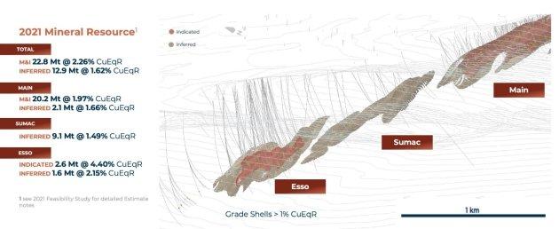 – Aufgrund der Erkenntnisse aus dem Minenentwurf im Rahmen der Machbarkeitsstudie im Jahr 2021 wäre der Zugang zu den vermuteten Ressourcen in der Lagerstätte Sumac und anderen vermuteten Ressourcenblöcken am Rande der Lagerstätte Esso eine kostengünstige Ergänzung des Projekts, sofern diese in eine höhere Ressourcenkonfidenz umgewandelt und das Material durch geeignete Studien als wirtschaftlich abbaubar nachgewiesen würden.
