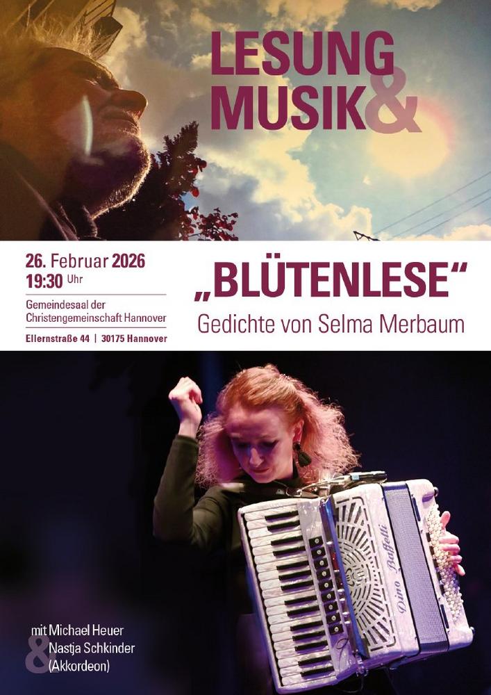 In der Lesung "Blütenlese" widmen sich der preisgekrönte Filmemacher Michael Heuer und die mehrfach ausgezeichnete Akkordeonistin Nastja Schkinder dem Werk von Selma Merbaum. Gespielt wird u.a. Musik von Rachmaninov, Scarlatti, Piazzolla und Rodrigo.