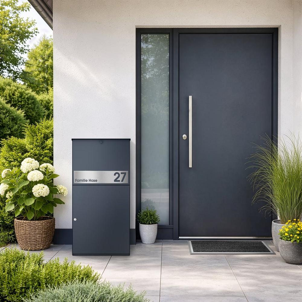 Optional lässt sich eine Beschriftungsblende mit Namen und Hausnummer integrieren. So wird der Paketkasten funktional in den Eingangsbereich eingebunden und zugleich individuell gestaltet.