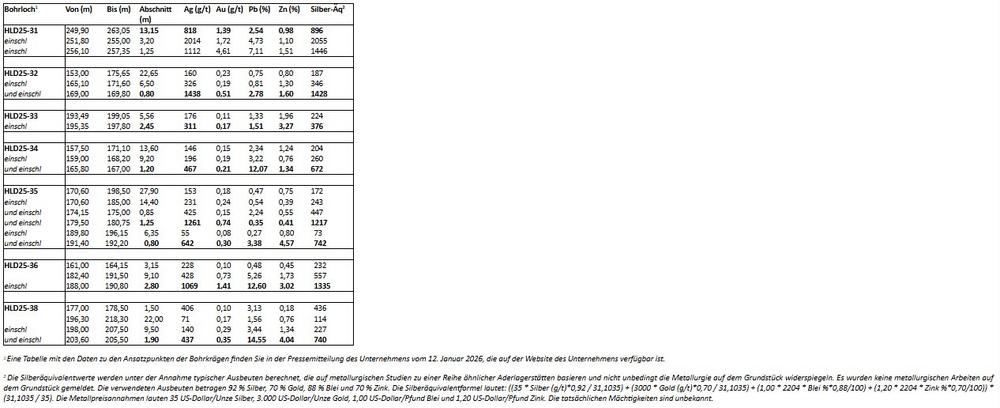 Der Höhepunkt des Programms 2025 war Bohrloch HLD25-31, das die Zone Main Fault etwa 90 m unterhalb von HLD24-30 durchschnitt und einen mineralisierten Abschnitt von 13,15 m mit durchschnittlich 818 g/t Silber, 1,39 g/t Gold, 2,54 % Blei und 0,98 % Zink ab einer Bohrlochtiefe von 249,9 m ergab. Ein Teilintervall dieser Mineralisierung ergab durchschnittlich 2.014 g/t Silber, 1,72 g/t Gold, 4,73 % Blei und 1,1 % Zink auf 3,2 m ab 251,8 m, während ein weiteres Teilintervall ab 256,1 m durchschnittlich 1.112 g/t Silber, 4,61 g/t Gold, 7,11 % Blei und 1,51 % Zink über 1,25 m ergab. Der Abschnitt HLD25-31 scheint auf ein stärkeres Einfallen der Struktur im Vergleich zur in den Bohrlöchern HLD24-29 und -30 beobachteten Neigung hinzuweisen. Darüber hinaus sind die erhöhten Goldgehalte, die im Hangenden des Abschnitts HLD24-30 beobachtet wurden, über das gesamte Intervall von 13,15 m zu beobachten.