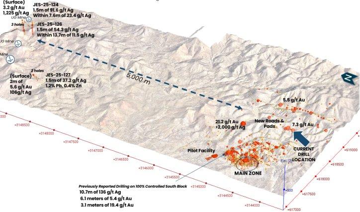 Die Bohrarbeiten im South Block schreiten nach dem Anfang dieses Monats bekannt gegebenen Wiederanlauf weiterhin effizient voran. Sechs Explorationsbohrlöcher wurden nun in vier neuen Zielgebieten mit hoher Priorität fertiggestellt, um zuvor noch nicht bebohrte strukturelle und geochemische Korridore mit hohem Potenzial für eine Gold-Silber-Mineralisierung zu untersuchen.