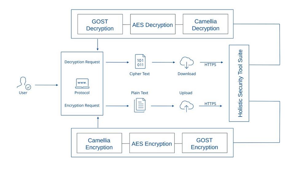 Standard encryption implementations rely on single algorithms, typically AES, which, while robust, create implicit dependencies on the cryptographic standards and certification authorities of specific nations. CypSec’s approach transcends this limitation through deliberate algorithmic diversification. Every communication session initiates with HTTPS between user browser and CypSec’s tool suite, then undergoes systematic chained cryptographic processing: Camellia (Japanese origin), AES (American origin), and GOST (Russian origin) operate in sequential layers, with each algorithm encrypting the output of its predecessor.