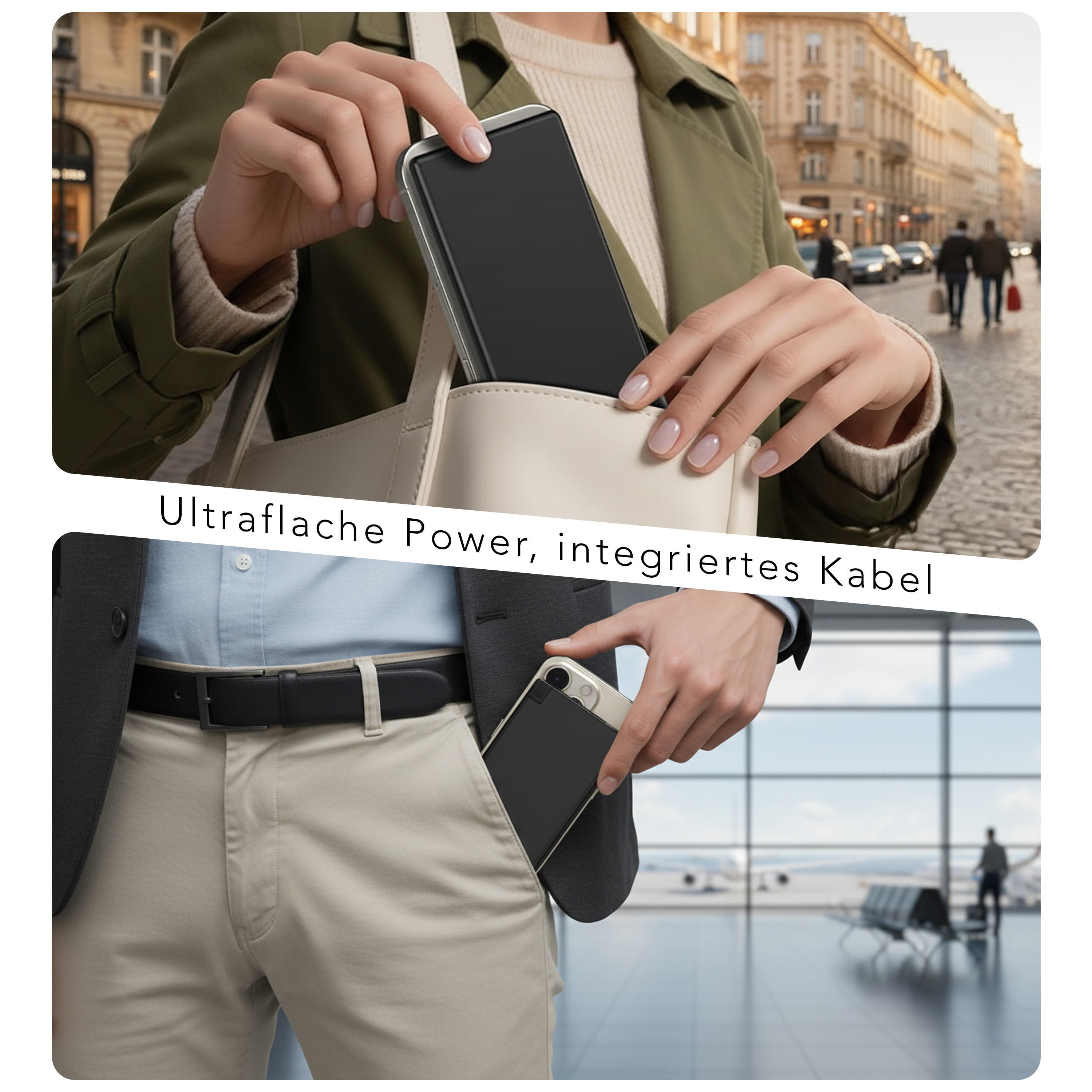 Kein Ladekabel nötig: Ein integriertes Kabel mit USB-C-Stecker ermöglicht den direkten Anschluss ans Smartphone – ohne lästige Kabelsuche oder Kabelsalat. Das macht die Powerbank besonders alltagstauglich auf Reisen und unterwegs.