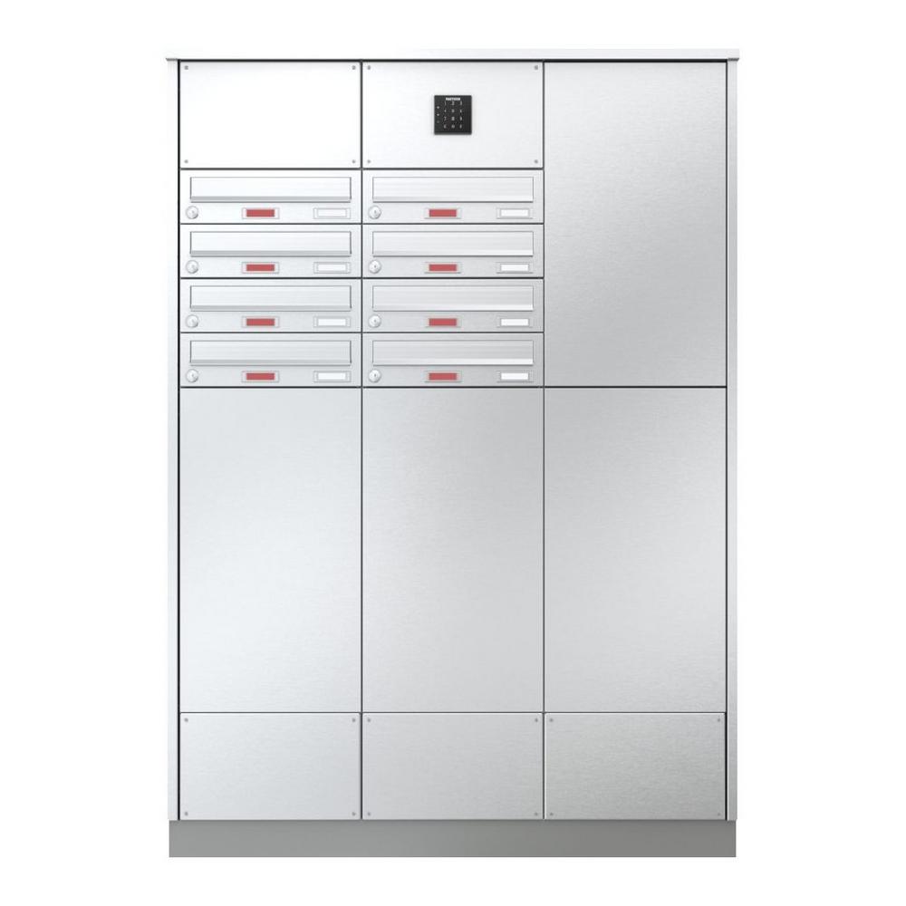 Paketanlagen werden objektspezifisch geplant. Variable Fachgrößen, Kartenleser, Türöffner oder Informationsmodule lassen sich integrieren. Über den digitalen Konfigurator können Kombinationen aus Paketbox, Briefkästen und Zusatzmodulen abgebildet werden.