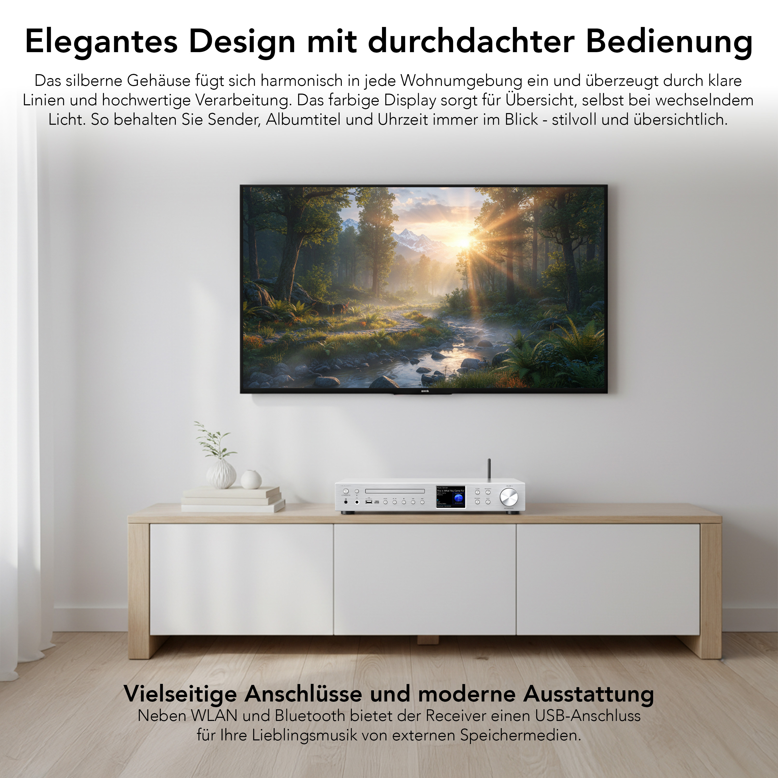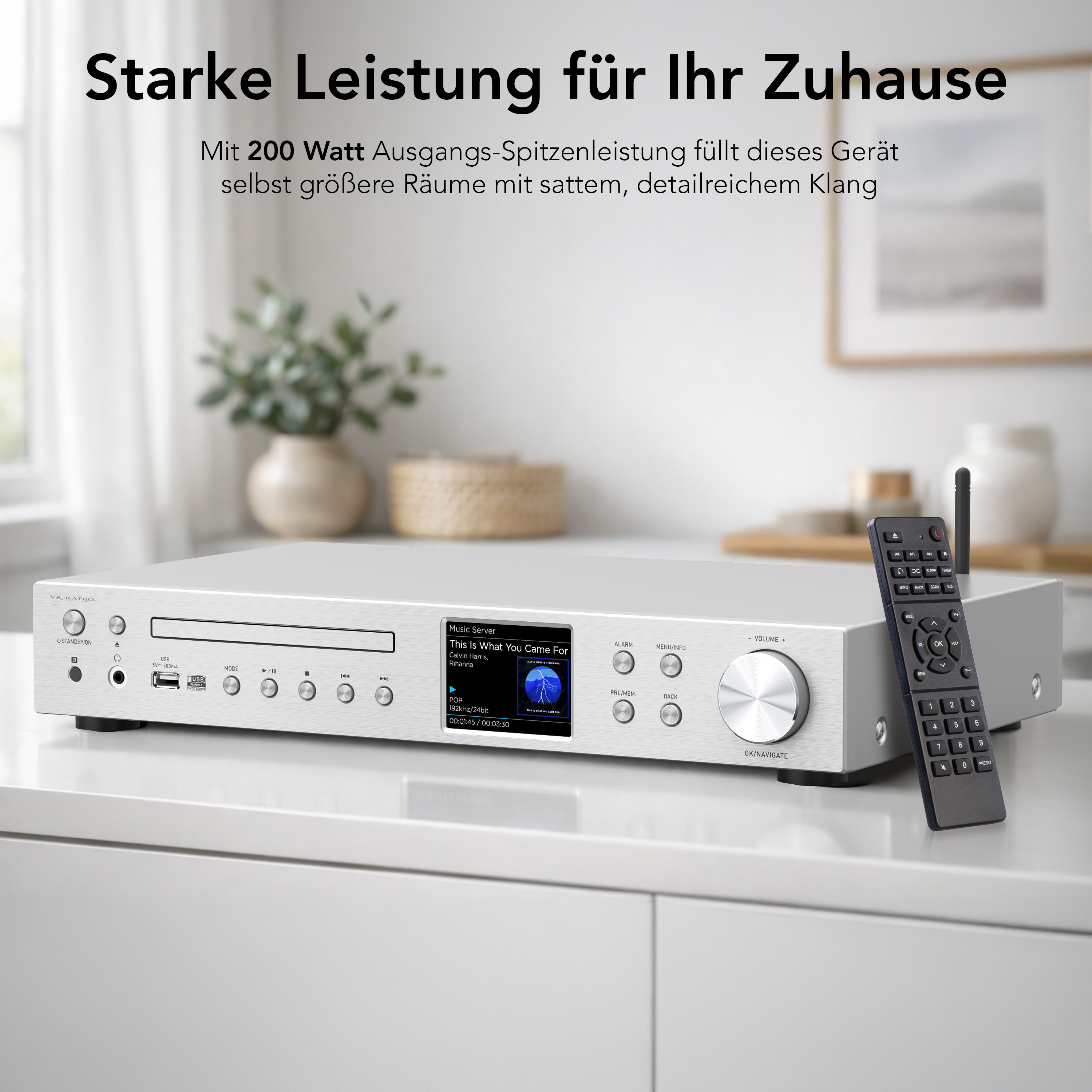 Starke Leistung für jeden Raum: Mit 200 Watt Ausgangs-Spitzenleistung füllt das Gerät auch größere Räume mit sattem, detailreichem Klang. Steuerung und Auswahl erfolgen bequem über das farbige TFT-Display oder per Fernbedienung – ob im Wohnzimmer, der Küche oder im Büro.