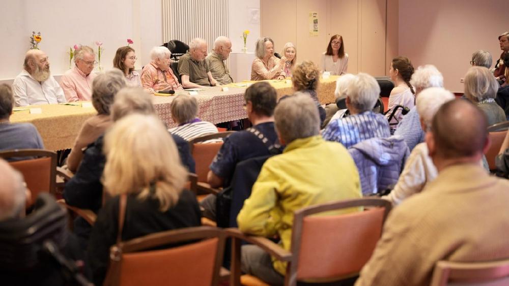 Die Ensemblemitglieder lesen eigene Gedichte – entstanden in einer Poesiewerkstatt. Ihre Texte kreisen um den Frühling, um Natur, um Erinnerungen an Kindheit in den 1940er- und 50er-Jahren. Auch Werke der verstorbenen Mitbewohnerin Aldona Gustas, einer renommierten Malerin und Dichterin, finden ihren Platz – eindringlich vorgetragen, voller Kraft. Udo Thiel erzählt von seiner Kindheit auf dem Land: Kühe eintreiben, als Lohn ein Wurstbrot und 20 Pfennig. Die Bäuerin sei „netter als meine Mutter“ gewesen – weich, zugewandt. Die eigene Mutter hingegen: hart. Ursula Krupp flüchtet in ihren Erinnerungen auf die Wiese, wenn der Streit im Haus zu groß wird – hinein in eine Welt aus Pflanzen, Insekten und Schmetterlingen. Doch sie schreibt auch über den Frühling im Krieg. Der Rhythmus ihres Gedichts trägt die Angst eines Fliegeralarms. Im Raum wird es still, als sie liest: „Da ist erst kein Gefühl, nur Reaktion. Überlegungen hätten das Leben gekostet. Und der Frühling kam trotzdem.“