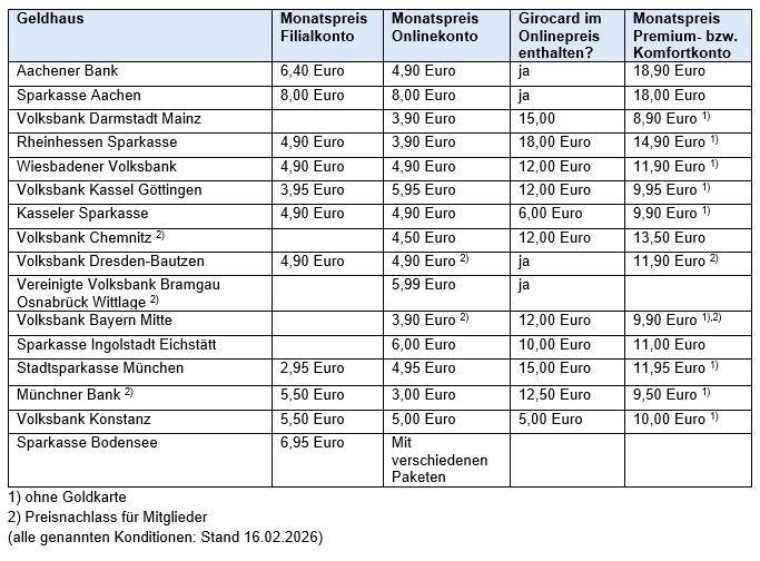 In der nachfolgenden Übersicht präsentieren wir die Preise von klassischen Filialkonten – wenn es diese noch gibt, die man auch über die Filiale führen kann. Im Vergleich dazu sehen Sie die Monatspauschalen der Onlinekonten sowie die Preise der Girocard für Inhaber dieser Konten und einen Hinweis, ob diese noch im Monatspreis enthalten ist. Und als Alternative dazu gibt es das Konto zum höchsten Preis des Anbieters. Dieser Pauschalpreis umfasst alle wesentlichen Dinge des Zahlungsverkehrs privater Konten. Darin ist manchmal auch eine goldene Kreditkarte mit umfangreichem Reiseversicherungs-Paket enthalten.