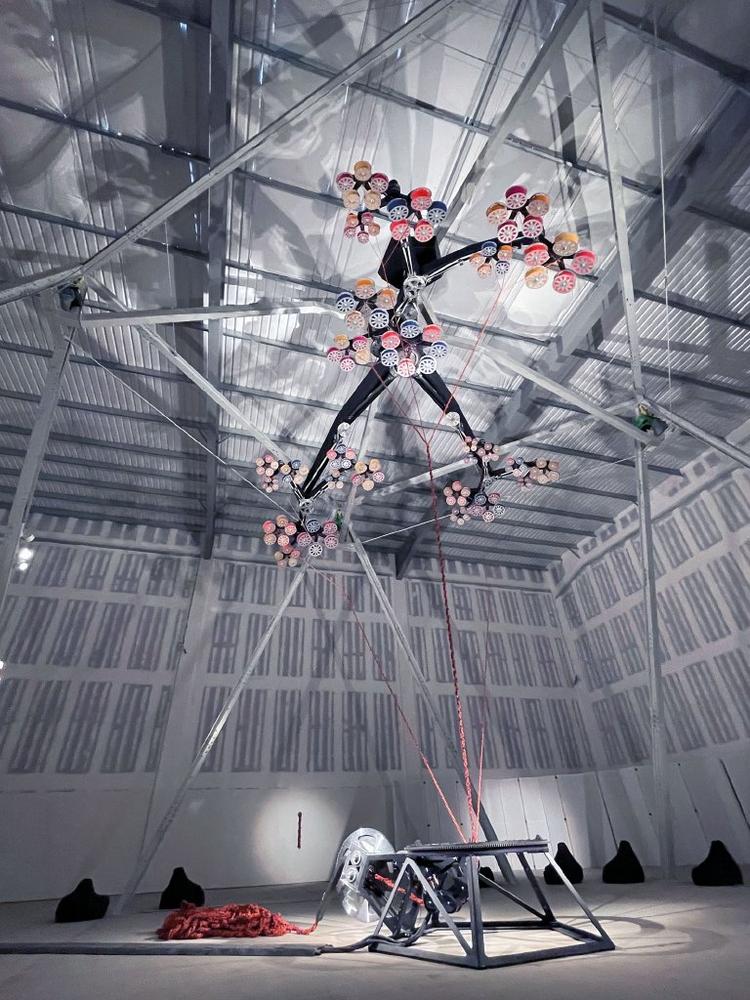 Das Werk des britischen Künstlers Conrad Shawcross besteht aus 40 ineinandergreifenden Armen, die fortlaufend ein Seil verweben und dabei die Bewegungen des Sonnensystems nachvollziehen. Mit zehn Metern Höhe und zwölf Metern Durchmesser verbindet die Installation künstlerische Vision mit hoher technischer Komplexität.