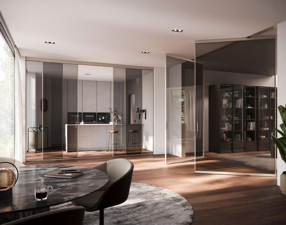 Beide Türmodelle sind in mehreren Profilfarben erhältlich, darunter Silber, Hell und Dunkel Bronze, Weiß, Schwarz matt und seit Kurzem auch die Trendfarbe Champagner. Für besondere Individualisierung ist eine Lackierung in Sonderfarben nach RAL möglich, sodass sich die Pivottür in jede Wohnsituation einfügt. Dank der schlanken Profile wird die Füllung in Szene gesetzt, welche ebenfalls aus einer Bandbreite an Gläsern und dekorativen Materialien ausgewählt werden kann. Besonders durch den Einsatz von Glas bleibt alles hell und einsehbar, während die Pivottür XL S1200 bei Bedarf als Raumteiler fungiert.