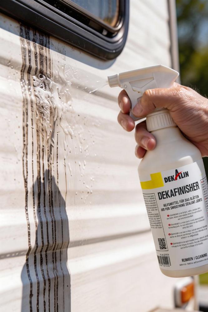 DEKAFINISHER ist ein wasserbasiertes Glättmittel und wurde ursprünglich entwickelt, um die Oberflächen von MS-Polymer-Klebstoffen und Dichtstoffen nach dem Auftragen sauber zu glätten. Nun machte die DEKA Kleben und Dichten GmbH unter der Leitung von Klebepapst Michael Windecker jedoch eine zusätzliche Entdeckung: Das Mittel löst hartnäckige Verschmutzungen an Caravan- und Wohnmobiloberflächen zuverlässig und materialschonend. Vor allem Regenstreifen und Kühlwasserstreifen an Kühlschranklüftungsgittern lassen sich damit schnell und einfach beseitigen.