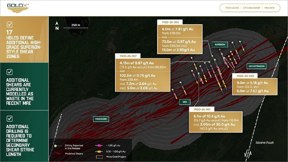 • Zwei Bohrlöcher, MQD-26-356 und MQD-26-357, wurden im Rahmen des laufenden Infill-Bohrprogramms durch die Kernscherzonen der QES-Zone verlängert und durchschnitten breite, für die QES-Zone typische Mineralisierungszonen, darunter: