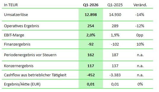 Der operative Cashflow ist mit rund EUR 0,5 Mio. negativ. Das Konzernergebnis belief sich auf EUR 0,1 Mio. (Vorjahr: EUR -0,1 Mio.). Das Ergebnis je Aktie beträgt EUR 0,01 (Vorjahr: EUR 0,01).