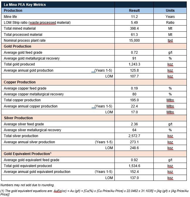 • Strong Production Profile: Average annual production of 152.4 koz Au equivalent ("AuEq") over the first five years of operation, and total life of mine ("LOM") production of 1.5 Moz AuEq (comprising 1.2 Moz Au, 2.6 Moz Ag, and 195 Mlbs Cu) over an 11.2 year projected mine life.