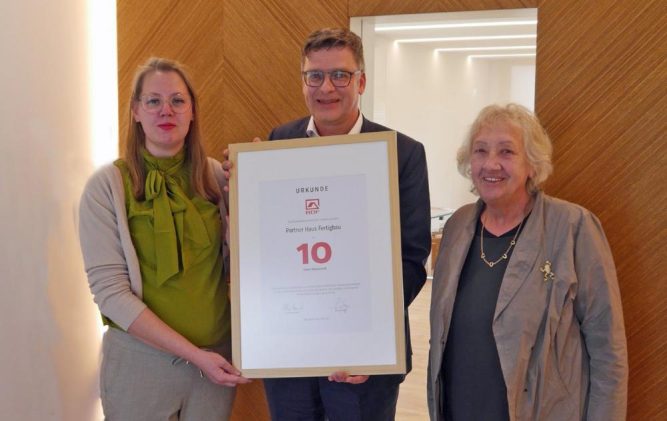 Seit 10 Jahren ist Partner-Haus aus Medebach Mitglied im Bundesverband Deutscher Fertigbau (BDF). Aus diesem Anlass überreichte BDF-Geschäftsführer Georg Lange jetzt eine Urkunde an Ute Lefarth-Kaufhold, Geschäftsführerin des sauerländischen Familienunternehmens. „Partner-Haus hat sich der Planung und Realisierung energieeffizienter Holz-Fertighäuser verschrieben und erfüllt dabei seit 2013 die umfassenden Anforderungen unseres Verbandes. Bei BDF-Unternehmen wie Partner-Haus sind […]